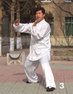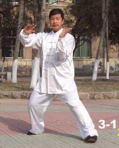 3、眼法不变向北。身继续右转,右腿仍顺缠弓膝,松塌裆劲。左腿提膝经右腿里侧,勾起左脚尖,以脚跟贴地逆缠,走里前弧线,向左前方前进约二肩宽(最大三肩宽),成左扑步。右手同时仍逆缠走外右上弧线继续向右上斜角上转,高与眼齐,距眼尺许,手心仍侧向右前下斜角,中指仍扬向左前上斜角。左手配合右手顺缠,走里右上弧线松肩收肘,肘尖收到胸前,手的高度不变,手心仍侧向右后上斜角,中指仍扬向左前上斜角。两手距离仍保持一小臂宽(图3,3-1)。