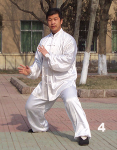 侧面 4、眼法不变向北。身略左转,胸仍向右前斜角。左腿变顺缠,弓膝塌裆劲落下脚尖。右腿变逆缠,膝仍弓住,脚不转动成左侧马步。同时左手变逆缠,以腕为轴,沉肘走里左下弧线转到胸前,距心口半尺许,手心侧向右后下斜角,中指扬向右前上斜角;右手配合左手变顺缠,松肩沉肘走外左下弧线转到脐前,如推物之状,手心侧向左前上斜角,中指扬向右前上斜角,双手距离一小臂宽(图1-4).