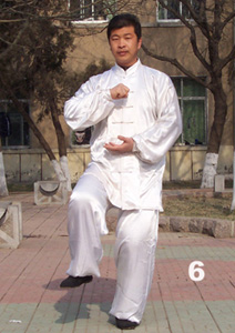 6、眼法不变向北。身略右转,胸向正前方。左腿变逆缠,弓膝塌裆劲。右腿变顺缠,提膝走里上弧线到裆前成左独立步。同时左手变顺缠,松沉肘部走里左下弧线,转到胸前,手心侧向右后上斜角,中指扬向右前上斜角。右手配合左手继续顺缠,松沉肘部,以小指领劲依次旋转握拳,并贴左腕上侧向里旋转到左掌心上方五寸许,拳心侧向右后上斜角,拳眼侧向右前上斜角(图1─6)。