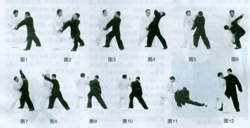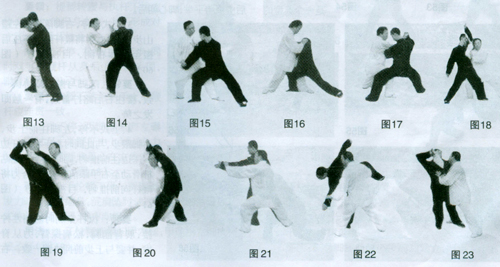 1、敌以左手击我,我左手拥接以外旋手控其左肘关节处,我右膊屈肘向其左肘或胸口击撞(图12)。  2、敌以右拳击我面,我进步插裆,左手上掤,手内旋外挒,迅即向左转身,用右肘向其心口外撞击(图13)。