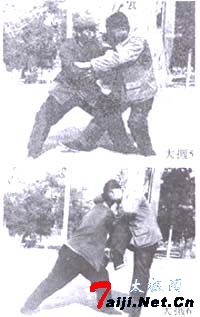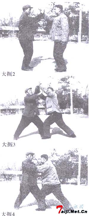活步推手也叫大履,履以步法为主手法为辅,其步法主要有两种:一是“脚踏中门”,即自己的前脚沿对方的两脚中问趟进,以自己的膝对着对方的会阴穴(裆部);再有一个是套索,即以自己的前脚沿对方前脚的外侧走一个小弧,以自己的脚跟贴对方的前脚跟部,再以自己的阴陵泉穴贴对方‘的前小腿的阳陵泉穴,注意是贴不要用力。这两种腿法是王培生老师特别提出的。这两种腿法使对方处于不稳定状态,而自己是平衡和稳定的。脚踏中门是以进胯为主,而套索则是以膝的动作为主。活 步推手不但要有掤履挤按还要有采挒肘靠。采是自己的手心(内劳宫穴)有向地面下按的意动,产生反拿的劲路。捌是和对方有相反方向的一种带有弹性力的劲路。肘是肘在屈使,以自己的手心(内劳宫)找自己的肩井穴和云门穴,以肘尖部攻击对方,共有十六种肘法,要注意使用,不然要伤人的。靠是肩入背靠,肩与背的合作要注意一个是入,一个是背要圆,这样才能保持身体的平衡和稳定。步法都是以弓步为主,并且有胯打的作用在内。以上是讲了活步推手的主要方法。