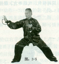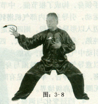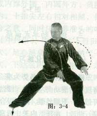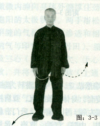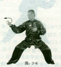 动作一:以预备势为准。身桩端然恭立,以中气潜转为轴,肾气横向滚动向左传递,腰劲向左旋套,身体螺旋下沉,双肩松开似脱,下塌外碾,内卷里合,右催左领,引导肩井、云门、极泉、曲池、曲泽、内 关、劳宫、膻中、中脘、气冲、气海、足三里、昆仑、涌泉等诸穴内气机潜转,膻中穴微向内含,心气与横膈膜同步沉降,胸腰由右向左做下弧运化动作。以左手为主,右手为宾。左手出劲逆缠,自左胯外侧折腕旋转,借助旋腕转膀之劲,画下弧运展至身体左侧下方,气聚轴腕,上搠下折,肘微里合 ,高与脐平,手指松直向左偏下,虎口撑圆,劳宫穴内含,掌心向内;右手入劲顺缠,自右胯外侧折腕旋转,借助旋腕转膀之劲,画下弧运展至身体中线前约20厘米,气聚轴腕,上掤下折,肘微里合,高与脐平,手指松直向左偏下,虎口撑圆,劳宫穴内含,掌心向内。同时,松右胯,泛左臀,双胯挣衡前卷里合,开膝合膑,双腿里缠,十趾抓地,裆部撑圆,借助旋踝转腿之劲下弧调裆,重心移于左腿,右足出劲以脚跟内侧向右铲地而出,开步约80厘米,脚尖上翘里合,重心七三分成,腰劲向下松串,注入脚底植地生根。 周身合住劲,同时吸气,气结中宫,眼注视右下方,耳听身后,兼顾两肾(图3-3、3-4)。 动作二:接上势。顶劲虚虚领起,以中气潜转为轴,肾气横向滚动向右传递,腰劲向右旋套,身体螺旋下沉,双肩松开似脱,下塌外碾,左催右领,引导肩井、云门、极泉、曲池、曲泽、内关、劳宫、膻中、中脘、中极、气冲、会阴、尾闾、委中、膝眼、足三里、昆仑、涌泉等诸穴内气机潜转,膻中穴微向内含,牵动往来气贴背,胸腰由左向右做上弧运化动作。以右手为主,左手为宾。 右手出劲逆缠,自身体中线前坐腕旋转,借助旋腕转膀之劲,画上弧运展至身体右侧上方,乘肩部的转关过节,由逆缠变为顺缠,放松落点,气聚轴腕,内折外掤,肘微里合,高与眼平,手指松直向右侧上方, 虎口撑圆,劳宫穴内含,掌心向前;左手入劲变为逆缠,自身体左侧下方折腕旋转,借助旋腕转膀之劲,屈肘画上弧运合至身体右胸前,气聚轴腕,内折外掤,肘微里合,高与胸平,五指弯曲放松,形似虎爪,虎口撑圆,劳宫穴内含,掌心向内。同时,松左胯,泛右臀,双胯挣衡前卷里合,开膝合膑,双腿里缠,十趾抓地,裆部撑圆,借助旋踝转腿之劲上弧调裆,重心移至右腿,六四分成,右脚尖落下踏实,五趾及时抓地,腰劲向下松串,注入脚底植地生根。 周身合住劲,同时呼气,气聚中宫,眼注右手,耳听身后,兼顾两。肾(图3—5)。 动作三:接上势。虚领顶劲,以中气潜转为轴,双腰隙横向传递,肾气滚动,腰劲向左旋套,身体螺旋下沉,双肩松开似脱,下塌外碾,右催左领,引导肩井、云门、极泉、曲池、曲泽、内关、劳宫、膻中、中脘、中极、气海、气冲、会阴、尾闾、委中、膝眼、足三里、昆仑、涌泉等诸穴内气机潜转,膻中穴微内含,心气与横膈膜同步沉降, 胸腰由右向左做下弧运化动作。同时以左手为主,右手为宾。左手出劲变为顺缠,自身体右胸前折腕旋转,借助旋腕转膀之劲,画下弧运合至左胸前,气聚轴腕,外掤内折,肘微里合,高与胸平,手指放松,自然弯曲,形似虎爪,虎口撑 圆,劳宫穴内含,手掌心向内;右手人劲变为顺缠,自身体右侧上方坐腕旋转,借助旋腕转膀之劲,画下弧由身体右侧上方缠绕半圈,气聚轴腕,上折下掤,肘微里合,高与肩平,手指松直向右偏上,虎口撑圆,劳宫穴内含,掌心向前。同时,松右胯,泛左臀,双胯挣衡前卷里合,开膝合膑,双腿里缠,十趾抓地,裆部撑圆,借助旋踝转腿之劲下弧调裆,重心移于左腿,六四分成,腰劲向下松串,注入脚底植地生根。 周身合住劲,同时吸气,气结中宫,眼注视右手,耳听身后,兼顾两肾(图3—6)。 动作四:动作和要求与动作二相同(图3—7)。 ![]() 动作五:动作和要求与动作三相同(图3—8)。 要点说明: 1.胸腰运化是陈式太极拳加强身体画弧运圈的锻炼。以上介绍的动作。其中动作一为训练的起手势,动作二至动作三合起来为第一圈,动作四至动作五为第二圈,以此类推,循环无端。每日练习百圈千圈,一旦纯熟,即可悟到身体圆圈运动之趣。 2.以上动作是以右手自身体右侧上方、左手在胸前互为主宾同时旋转。关键要了解和掌握以下的左右转、缠方法:胸腰先自右向左做下弧的运化动作,然后自左向右做上弧的运化动作,为右顺转法;反转之,为右逆缠法。另外,以左手自身体左侧上方、右手在胸前互为主宾同时旋,胸腰先自左向右做下弧的运化动作,然后自右向左做上弧的运化动作,为左顺转法;反转之,为左逆缠法。 3.胸腰运化的动作训练,以外形而观之,主要是以胸圈和腰圈横向立圆运动为主,以套腰劲为动力带领双肩和双胯互相催领传递,使肋部如同鱼鳃一样在阴阳开合的运动中自然旋转。其关键在于腰、肩、胯旋转协调一致、连贯顺遂,并以身运手,以手领身,构成了根节催、中节随、梢节领、节节贯串的螺旋缠绕运动,引导身体内部气机潜转,结束以意导形的基础训练过程;迈入以形导气阶段,则四肢走圆画圈较大,身圈旋转较小,一旦纯熟,身圈旋转逐渐扩大,四肢旋转逐渐内敛,致使内气充盈,引动中气潜转为轴,方能步入以气导形阶段。年积力久,再经过以意导气练习,四肢圈与身圈会继续向体内收敛,直至退藏隐密,劲与神合,举手抬足有圈不见圈,即是陈式太极拳有圈意而无圈形的高级境界。 4.裆劲变化与调整,主宰着重心的虚实转换。乘裆劲调整和重心移动之机,注