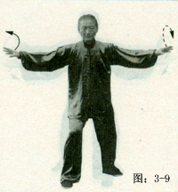周身合住劲,同时呼气,气聚中宫,眼注前方,耳听身后,兼顾两肾(图3—9)。