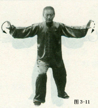 周身合住劲,同时呼气,气聚中宫,眼注右手,耳听身后,兼顾两肾(图3—11)。