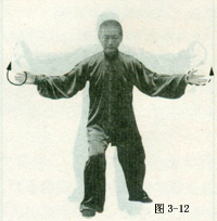周身合住劲,同时吸气,气结中宫,眼注前方,耳听身后,兼顾两肾(图3一12)。