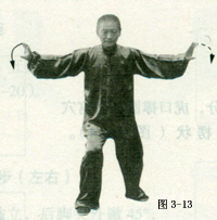 周身合住劲,同时呼气,气聚中宫,眼注视前方,耳听身后,兼顾两肾(图3一13)。