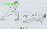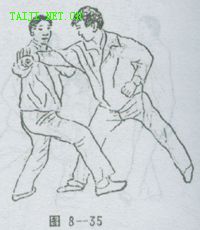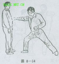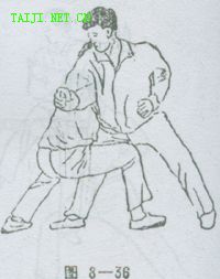 ![]() 陈式太极拳套路的招招势势,无一处不包含着变幻万端的技击玄机,灵活运用,进退攻防,逢凶化吉,无所不胜。金刚捣碓在攻防实战中运用尤为广泛,可变化出层出不穷的奇招。这里仅列举其中40例实战变化,读者可举一反三,自己琢麝其它招式在攻防当中的奥妙。8.侧肩靠 (1)甲方太极起式站立,乙方上右步,出右拳,直攻甲方胸部(图8—34)。 (2)接上势,甲方伸右手自左向右接住乙方右拳,甲方将重心移至左腿,抬右腿上步于乙方右腿内侧,甲乙双方两腿相接为宜,同时以 左手搭在乙方大臂处,双手将乙方右臂捋向甲方身体右侧,使乙方丧失进攻能力(图8—35)。直拳而入并非闲,不知妙手太极玄, 转体伸手拨云雾,云雾散处力化空。 (3)接上势,甲方将乙方继续向右捋,让乙方失去反抗能力,同时迅速将重心移至右腿上,含胸、塌腰,周身上下蓄合,并将右肩沉下,落在乙方右肋处(图8—36)。 (4)接上势,甲方疾速不停地将重心继续前移,继而发肩劲或以平肩、突肩将乙方连根拔起发予外(图8—37)。 一个出拳似流星,一个接拳急如风, 一引一上紧贴肋,腰脊一扭脚腾空。 ![]() |