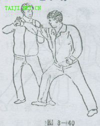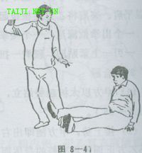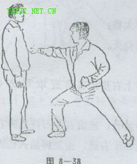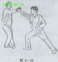 陈式太极拳套路的招招势势,无一处不包含着变幻万端的技击玄机,灵活运用,进退攻防,逢凶化吉,无所不胜。金刚捣碓在攻防实战中运用尤为广泛,可变化出层出不穷的奇招。这里仅列举其中40例实战变化,读者可举一反三,自己琢麝其它招式在攻防当中的奥妙。9、里合腿 ![]() (1)甲方以太极起势站立,乙方上右步以右拳猛击甲方胸部(图8—38)。 (2)接上势,甲方随即出右手接拳,并且身体向右旋转90度,缩小乙方正面进攻交锋的身体面积(图8—39)。 (3)接上势,避开乙方锋芒后及时把乙方向身右侧引,随即把左脚插入乙方右脚后。左手搭在乙方右大臂上,此时乙方身体已有失重之感(图8—40)。 ![]() 流星扑面飞过来, 扭身一转化入烟; 顺势抛出里合腿, 勾打跌倒重心飞。 (4)接上势,甲方将乙方右臂继续向上领,使乙方重心前倾于右腿,此时甲方收小腹,提起左脚,迅速以里合腿勾打乙方右脚,同时两手一齐向乙方胸前击打,左脚同时到位,使乙方仰面跌倒于甲方左旁(图8—41)。 ![]() 不是五趾投抓地,不是立足不太稳; 只是虚惊将敌诱,回头一折面仰天。 |