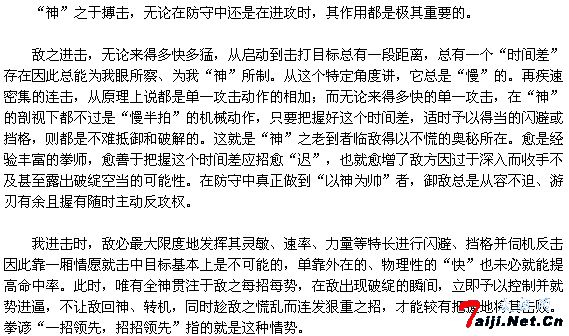 | 以长于实战著称的中华传统武术,虽流派繁多、技击特色各异,但其搏击(指不戴手套、不受任何规则约束的徒手搏斗)的最高着意点从本质上说却都是相同的——无不高度重视“神”对“形”(指搏击的动作、速度、力量等外在因素)的统帅作用。 所谓“神”,指的是为武者在搏击中对敌我双方的招势往来、体位距离、动作速率、攻守时间差等要素适时全方位的眼察心断及同时产生的应对意识。它是搏击动作的统帅是在瞬息万变、激烈残酷的生死拼搏中占据主动地位从而克敌制胜的关键。 ![]() 总之,在搏击中无论是守还是攻,都只有首重“神”的作用眼察心制,以神驭形,才能彻底克服胆怯、慌乱、急躁、蛮拼等不良心态,超越“盲目打斗”的低级层次,从搏击的“必然王国”上升到“自由王国”。 “神”在搏击中如此重要所以,传统武术历来十分重视对它的严格要求:各门派功法中都有这方面的专项训练(如紧盯燃烧的香头、凝神追视小飞虫等),拳诀中也都有关于“神”的重要性的各种表述,如“一打眼,二打胆,三打手脚快与慢”、“神乱则意乱,意乱则拳乱”等。武侠小说中常有武者袭击他人前先设法扰乱其神的描述,如以器物投掷、以怪声惊扰等这也是“神”在搏击中无比重要的生动例证。 倘非如此,则人们于搏击中必首重外在之“快”与“猛”,那么,素以“快”与“猛”而著称的美式拳击也就理所当然地成为无敌于天下的最佳搏击术了。 |