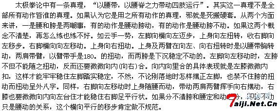 习练太极拳到定阶段,较长一段时间不见进步,总觉得缺点儿什么。可又不知道问题在哪里。找不出问题所在,再练就是盲目地瞎练,甚全可能越练越糟。冷静下来,对照规范的榜样检查对比一下,就会发现问题不在大形大架,而在于细微处和转折处。很多动作只有笼统的空架子,而缺少细微充实的内容。岂不知一套拳或一套器械,每一个动作并不是定势好就算好,而在于它充实细致的内容。有没有韵味,充实不充实全在于每一处的细微之处。