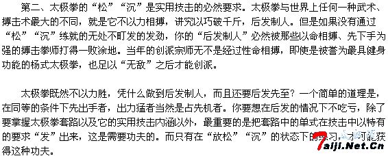 单就攻击动作而占,这样的攻击动作第一是点多——放松的身体可以将力量集中到任何一个部位,头、肩、肘、手、膝、足、胯均可攻击。第二是隐蔽——放松的身体儿乎不需要做准备动作,意到、气到、力到,犹如猎豹扑食。第三是线短——太极拳的发劲儿乎不需要出拳的距离,贴着肉发劲就可以震伤对手的内脏,甚至夺人性命。