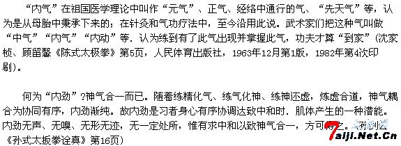 但我在里要说驯一点,太极拳的内劲所表现出来的功力,决不是有些气功师说的所谓“外气”。科学已证明,所谓“外气”是不存在的。一个具有高超太极拳内劲的人,可能把一个身重90公斤的人仆于丈外,但不能把一个重几十公斤的重物,不接触就能推之丈外。因为人是活的,在发功时往往采用“引进落空”的技巧,“借力打人”“四两拔千斤”,而物是死的,是无法运用这些技巧的。