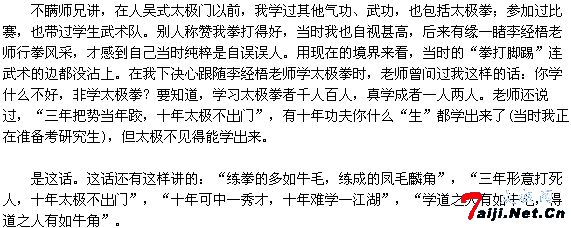 而我们的功夫、辈分和知名度等都不及前贤,不免人轻言微。但前辈开拓的治学道路我们应扎扎实实地走下去。水平技法方面,我们要学;讲实话、求真理这方面,我们要学;彼此尊重、共成大业这方面,我们更要学。“见贤思齐”嘛!关于有人进一步追问文、武属性的问题,我是这样思考的:太极拳既姓“文”也姓“武”(在最高境界、文武之道是相通的),但太极拳绝不应该是格式化的“操”和表演化的“舞”(具体观点请见本章“相关连接”中我的论文《论“太极拳”》)。