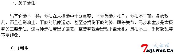 关于弓步,24式要求:“做弓步时,迈出的脚……脚尖向前,膝盖不要超过脚尖;后腿自然伸直,前后脚夹角约成45度—60度”(左右野马分鬃动作说明);还要求:“弓步时,两脚跟横向距离不超过lO厘米”(左揽雀尾、双峰贯耳、闪遥臂、转身搬拦捶动作说明)。42式对弓步的要求是:“前脚全脚着地,屈膝前弓,膝部不得超过脚尖,另一腿自然伸直……两脚横向距离约10-厘米”(《42式太极拳剑一附竞赛规则》)。88式则要求:“(后脚)脚跟后蹬……自然伸直”或“自然蹬直”(揽雀尾、抱虎归山动作说明):“两脚横向距离约10厘米”(揽雀尾、闪通臂、搬拦捶动作说明)。从上面动作说明可以看出,竞赛套路弓步定型的要领是:l、前弓脚膝盖不超过脚尖;2、后腿自然伸直或蹬直:3、前后脚夹角约成45度—60度;4、除搂膝拗步、野马分鬃、玉女穿梭几个拳式外,其它拳式弓步两脚跟的横向距离“约10厘米”或“不超过10厘米”。上述四点,恰恰违背了太极拳的拳法拳理,不是规范正确的弓步动作要领。