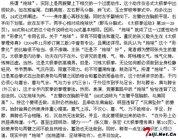 [page] 另外,在42式的个别拳式中,还出现“翘腕”的误导现象。如第十五式的两个玉女穿梭:“……而后右(左)掌翘腕至右(左)肩前上方,掌心斜向上……”。又如云手:“……右前臂内旋,右掌翘腕内旋,向左摆至右肩前……”。众所周知,太极拳对手腕和掌的要求是舒展松柔,不可僵硬呆滞。传统太极拳的拳法,除按式(包括双按掌和单按掌)需要坐腕外,其他如前立掌、坡掌、仰掌、俯掌、横掌、垂掌等均不需要坐腕,更不能“翘腕”。为什么?因为,除按掌外,太极拳要求其他掌法的腕与掌基本在同一平面上。这样的掌法,运动起来轻灵和顺,松柔舒展。而“翘腕”显然违背了松、沉、柔、活的原则,容易出现僵、浮、呆、滞现象。也可以说“一翘三个紧”:腕紧、肘紧、肩紧。三个紧了,就会影响太极拳的健身效果和技术功能。