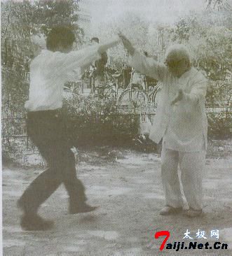 作者(右)讲解太极拳技击要领 如果说呼吸在我们的生命活动中是十分重要的,我看谁也不会反对。而在太极拳运动中它还有另一层重要意义。呼吸分两种,一是自然生理之呼吸,二是拳势之“呼吸”,也可说意念之呼吸。前者呼吸之气是空气,即呼出二氧化碳,吸人氧气。而后者“呼吸”之气是真气、元气。真气元气的“呼吸”是不大看得出的,而气是人人皆有的。但它不显露,更不是人人都能对它调制调动的。有其规律,只有部分人能指挥它,运用它。