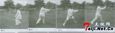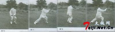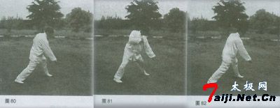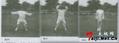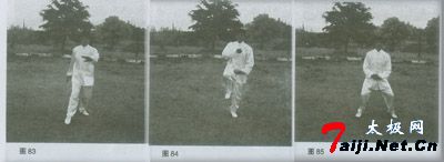 44.翻身劈砸护心捶 陈式太极拳二路、56式竞赛套路里的“护心捶”招式,散打中的招法之一。 接上势,左脚下落,右脚靠拢左脚,上身下蹲双拳同时由右侧向后撞击,再右拳在前,左拳在后,由下至左后向上乘身体向上腾蹿翻转向东,朝对手劈头盖脑砸下,左脚落在右脚左前方45度,成马步状左拳在前,右拳右胯旁,护心捶与第28势护心捶相同(图72、73、74、75)。 要点:下蹲后撞为吸气,翻身劈砸呼气,护心捶一吸一呼,动作要连贯协调,撞拳、翻转、纵跳、劈砸要有爆发力,节奏要分明。     45.左冲捶 陈式太极拳一路、二路中的招势,搏击中有此招。 接上势,双拳变掌,由上向下向左划立圆弧形,抓住对手右肩右臂乘右腿上提震脚之势向右下猛力捋带,紧接着右腿猛力蹬地,催胯带腰带脊双捶猛力冲打对手头面部,同时左脚向前移动少许成左弓步(图76、77)。 要点:划弧抓捋、震脚一致,蹬地转胯冲拳一致,整个动作一吸一呼完成。     46.右冲捶 双拳变掌由上向右下朝上划圆弧,抓住对手左肩、臂部,随左腿震脚猛力下捋,右脚落左脚右前方处成弓步冲双拳,其他与左冲捶相同(图78、79)。 47.栽花捶 太极拳中为“栽捶”、“击地捶”,是太极“五捶之一”,很适用于散打。     接上势双拳收回胸前,左脚向左前迈步成左弓步,俯向倒地对手头,背、腰连续击打,彻底打垮对手,这里分右左右3拳连续击打(图80、81、82)。 要点:俯身击打连贯有力,打得对手丧失战斗力为止。每打一拳醒气一次。 48.金刚捣捶 此势为陈式太极拳中的“金刚捣锥”势,搏击中很适用。     右拳由东向南摆击,身体由东向南转,身重移至左腿,提右脚、右拳向上勾打对手胸、腹部,左拳变掌划至腹前,掌心向上,右脚震脚落地,右拳砸左掌成马步(图83、84、85)。 要点:意欲向倒地对手猛踏一脚,猛捣一拳。转身摆拳,提膝勾拳,震脚砸拳连贯协调,节奏分明,震脚有声,砸拳有力。     在此势基础上可再打多遍,也可按退步跟随的步法,由东向西,动作不变一直打到弹踢射虎捶,再按进步方法打回到本势,主要为练习退步时动作的协调配合,退步方法为先退后步,再随前步。一次打一遍为学习阶段,一次连打3遍为初级阶段,一次连打6遍为中级阶段,一次连打9遍为高级阶段。到高级阶段,那将达随心所欲、出神人化的境地了。 收 式 双手在腹前由右至左揉转一小圈,分左右伸展双臂,掌心向上合至印堂穴处,翻掌心向下,同时深长吸气,随呼气双手缓缓下按,引气归丹田,收左脚落在右脚旁,两手垂落胯侧。静立片刻(图87、88)。  |