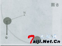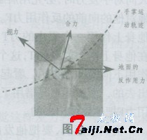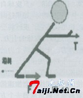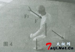 太极拳又要求在走架时,前进后退“行走如猫步”。“行走如猫步”,为的是使练拳的人在运动过程中,保持身体重心能平稳地从一个招式过渡到下一个招式,并始终保证身体重心落在支撑面内,使人体时时处于中定状态。 在运动和发力的过程中,太极拳要求膝不过尖(脚尖),如图3的搂膝拗步式。我们知道,从力学的稳定性看,重心落在支撑面内,物体处在平衡态中;重心落在支撑面的边缘时,物体便容易被外力推翻;如果重心落在支撑面的外面,那么就不推自倒了。在推手时,如果膝盖越出了脚尖,那就很容易被对手用采劲击倒。 太极拳走架时,从起势开始,即要求练拳者把重心降低,并在整套拳的习练过程中基本上保持这样一个高度。这一方面是为了锻练下盘的力量,另一方面更是为了降低重心提高身体的稳定性。 太极拳运动正是在维护自身的中定(自身重心的稳定)、破坏对手的中定(对手重心的稳定)中进行的运动。 太极拳运动中的力 太极拳论云:“用意不用力。”为此,有人认为太极拳只有强身作用,而无技击格斗功能,这样理解就错了。 太极拳作为一种武术,它除了能强身外,当然还具有技击的功能。俗话说得好,没有不能打人的拳,当然也没有不用力就能打人的拳。只是太极拳的用力,是通过意念的作用而发出的力,所以较之一般而言的力具有深层的意义,是高质量的力。 我们知道,“力”是物体对物体的作用。仅仅对于一个物体而言是无“力’j可谈的。一个人静静地在练太极拳架,这时除了人与地面发生力的作用外,就没有第三个物体可以受力了。大地对人有支持力和摩擦力,人借此在地面上平稳地前进后退、左顾有盼。倘若人在练架子时也有意识地用力,那只能攥紧拳头绷紧肌肉,结果不但不能练出太极拳技击需要的灵活而又“高质量”的力,反而会造成人体气血阻滞,久之不但不能健身反而会伤及健康,这岂不适得其反。 那么,太极拳中的“力”又是怎样的高质量的力呢? 太极拳论在提出“用意不用力”的同时,还要求习练者宁心聚神、虚领顶颈、含胸拔背、沉肩垂肘,进入一种“松、静、舒缓”的境界。太极拳运动中的力是一种个体处在松、静、舒缓状态下,神气内敛,在高度集中的意识控制下发出的力,是一种整体的力。它绝不仅仅是一只手、一条腿发出的力。“凡此皆是在意”,就是这个意思。 仍以图3的搂膝拗步为例。当右手向前推出时,意在右脚的脚跟,右腿向后蹬的同时,身、腰、手同时向前移动,通过右腿向后蹬的动作,地面作用在右脚的向前的反作用力通过腿、腰、脊背、肩臂和手而作用在对手的身上。这是一个整体的动作,是一个“其根在脚,发于腿,主宰于腰,发于脊背,达于肩臂,形于手指”,最终作用在对手身上的整体连贯的力。 太极拳论中又指出“人少横力”,如果人受到横向力的打击,重心很容易离开支撑面而跌倒。因此,拳论中又有舍其正中打横中的说法。 我们再次用搂膝拗步的发力作为例子。当右手向前推出时,要求手沿着耳根向前方推出。这时,手受到的反作用力的方向正好是在腿伸展的平面上,这个力对于施力体(自己)也正好是一个正向f不是横向)的力,因此自己就不容易被反作用力推倒。 如不然,如图4所示,如果右手推出的方向不在与腿同一个平面上,那么施力体受到的反作用力就会有一个横向的分力F,也就是这个分力F,可能使施力体(自己)站立不稳而跌倒。 大家可能都会注意到,练太极拳的一个明显的特征是“慢”,所谓“慢练出真功”。慢练是太极拳相对于其他拳种的一个明显的特点。它的具体好处很多,其中之一是有利于用意念支配动作,使形体听从意念的指挥,进而达到意到气到、气到力到,求得意、气、力的完美配合,从而使太极拳能发出高质量的力。 太极推手运动 太极推手是练习太极拳走架基础上的一种双人的对抗运动。练习推手,能帮助习练者深入理解太极拳架中一招一式的攻防含义和技击要领,对于促进太极功力的提高很有裨益。太极推手本身也是一种很有趣的运动形式。 太极推手的基本要求是不顶不丢、沾连黏随。当两人交手时(图5),两人受力分别如图6、7所示,如此两人便成顶牛之势,各自处于受力平衡状态。 此时,如果对方对我施加按力而我采用逃脱的办法,这就会“丢”,如果对方跟进对我发力则我必被击倒。所以双方推手时,一经搭手,就要把对方黏住,既不让对方逃脱,也不与对方顶牛,这就是“不顶不丢,沾黏相随”。只有做到沾黏相随,才能用自己的肢体“听对方的力(劲)”(也有说摸劲的),凭自己肢体的触觉来感受对方对我作用的力的大小和方向,并采取相应的手法化解对手的力和向对手发力。图8 那么太极推手时是如何化解对方的力的呢?我们可以先看这样一个实例。如图8,一只皮球自高处落下,当然会击中下面的物体。如果这时我们用一个圆弧形的轨道接住它,皮球将受到两个力的作用,一个是地球对皮球的引力,一个是轨道对皮球的弹力。正是这两个力的合力,给皮球提供了一个切向加速度与一个向心加速度。向心加速度改变了皮球运动的方向,切向加速度使皮球向切线方向加速运动。结果,皮球就沿着圆弧形轨道从另一个方向被抛了出去。 这在推手中就好比对方用掌向我袭来,如果我没有用搠劲,那这一掌必然击中我的身体而将我击出。这时,我用一个如图9所示的搠力(相当于轨道对皮球施加了