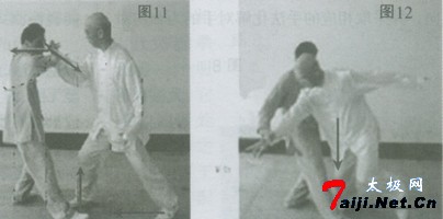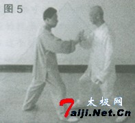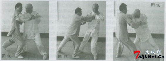 此时,乙用左手向甲右肩发力,结果被甲用腰的旋转力向右摔出。因为,甲正好借用了乙发力时左脚蹬地的反作用力(如图16所示)。 如果这时乙用右手向甲的右侧发力,则甲反被乙向后发出(如图17所示)。这是因为乙借用了甲旋转时右脚向前用力、甲同时受到地面对他向后的反作用力。 如果,这时乙立即下沉对抗甲的旋转发力,而甲立即跟进向乙的侧后方发力,乙必被甲向侧后方发出(如图18所示)。因为乙下沉对抗甲时,右脚必向前用力,同时他的右脚受到地对他向后的反作用力,甲正好借用了这个反作用力,将乙向后发放出去了。 同样的一招野马分鬃,化解时由于发力的方向不同、发力的时间不同、发力的作用点不同,便产生不同的效果。 前面已提及,太极拳技击的原则是后发制人,就是说不是凭借自己主观上要怎么发力就能怎么发力的,而是要凭借我感觉到的对手袭击我的力的大小、方向,以最快的速度作出反应,进行化力和发力。这也就是拳论中说的“动急急应,动缓缓随,神出鬼没,难以捉摸”。 化力与发力是不能分割的,这是一个整体的两个方面。拳论中有关化力与发力的叙述是:“与人交手,触身皆化,收之即倾,放之即出,柔化刚发,化劲要柔、要圆,发劲要刚、要直。化劲,化劲,化则进。”这也就是说,一化即发,中间是容不得丝毫停滞的。 太极推手中的化力与发力真是千变万化,妙不可言。 那么如何练习才能慢慢体会到其中的妙处呢?我在练习中体会到,练习推手时双方要相互喂劲,开始阶段最好喂给对方大一点、慢一点的力(所谓粗长的力),让对方化力发力。粗长的力比较容易感觉,时间长了,再喂以细长的力(小一点的力)让对方化解和发放,这样久而久之纯熟之后,自然能达到收放自如、熟能生巧的境界了。 在练习推手中,要注意切莫用蛮力蛮顶蛮撞,否则时间一长反而会练出一身拙力,这就适得其反了。 最后,如何检验太极推手中的化力与发力是否符合太极拳理呢?我想,可以这样自我鉴别:你自己感觉这样发力轻松吗,或者你被对手发得舒服吗?因为,合于太极拳理的发劲、化劲,应该是既轻松又舒服的。反之,如果发力一方与被发力一方都感到别扭而不舒服,那么总有一方不得要领了。