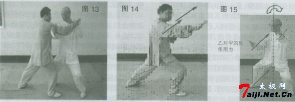 从中我们可以看出,乙之所以能将甲摔出,实际上只是借用了甲向乙发迎面掌时右脚蹬地的反作用力,整个过程只是用其人之力打其人自己。甲用力越猛,则自己跌得越狠。 但是,如果甲的迎面掌被乙化解后,乙没有及时向右下方发采劲,又会有什么样的结果呢?这时甲蹬地的力已消失,乙已无力可借了,当然也不可能用一个小小的采劲轻易将甲发放出去了。可见,乙对甲的化劲与发劲必须在短短的一瞬间完成。 我们再用野马分鬃一招来说明发力的过程。如图13所示,甲将右手从乙的腋下穿过对乙做野马分鬃欲将乙摔出,这时两人各自的受力如图14、15所示。