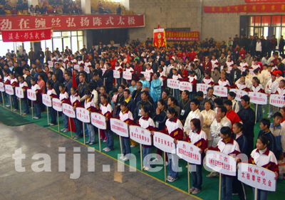 11月12日,太极拳发源地中国陈家沟。 尽管初冬寒意已至,却挡不住四海拳友匆匆赶赴太极圣地相聚的脚步。这天,简朴的温县太极武术馆因来自全国各地热情的人群而略显拥挤。上午8点钟,备受国内外太极拳友人、太极拳民间组织关注的2005年中国陈家沟传统太极拳邀请赛拉开了帷幕。来自英国、德国、加拿大和北京、上海、福建等全国14个省、市共65个代表队、近700名参赛选手应邀参加了比赛。在这次熙熙攘攘的参赛人群中,还有一支来自全国各地、成员近200名的特殊观摩队,也怀着对太极圣地和对传统太极拳的神往兴致勃勃来观看比赛。