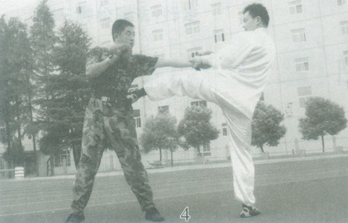 2,上动不停,对手右拳一击不中,又发左拳,这时我重心移于左腿,右臂拨开来拳,左臂顺势采劲砍击对手脖颈动脉(图2)。如对手格挡,我则起右腿抽击对手左肋部(图3);如对手闪避,我则重心右移起左鞭腿抽击对手左肋或踹击胸腹部(图4)。    [练习要点]本势动作主要练习自身左突右闪的整体协调能力。我本人在学习之始,也有老师讲此动作是叼托手。即对手用右拳向我进攻时我左手叼抓对手手腕,左手上托其肘(图5)。在经过多次反复练习后,这作动作做得都不成功。试想:在双方快速的击打对抗中,要想击中对手一拳或一腿都很困难,更何况是要抓住对方快速运动中的手腕.