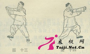 六、久扎金枪 [预备] 立正,抱肘。 [动作] 1.身体向右转的同时,右腿向右前方跨出一大步,脚尖向前,右腿屈膝下弯,大腿与地面呈水平,左腿伸直,左脚尖斜向前方,脚跟不离地,呈右弓步式(图十二)。 2.右手握拳向前方平冲出,右臂伸直,左手亦同时伸出,左肘微屈,两拳前后差一拳距离。目视前方。姿势摆定后,以均匀缓慢的速度呼吸3—9次(图十三)。 3.两拳收回腰间,仍呈抱肘式。 4.转体还原,呈立正抱肘式。 5.向相反方向进行,姿势同上(图十四)。反复做3—9次。   七、开弓射雕 [预备] 立正,抱肘。 [动作] 1.左手握拳向左方平伸,成侧平举,右手握拳置于左臂内侧,头转向左侧(图十五)。右腿向右侧跨出一大步,呈横裆步,与此同时.右臂向右移动,使右拳止干右朐前,目视左前方(图十六)。姿势摆定后,以均匀缓慢速度呼吸3—9次。 2.还原。 3.动作同①,方向相反。 4.还原。呈立正抱肘式。两侧交替做3—9次。  |