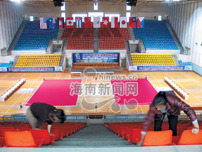 十二月十四日,在海口体育馆,太极拳健康大会比赛场地全新装饰,两位工作人员正在擦洗看台座椅。