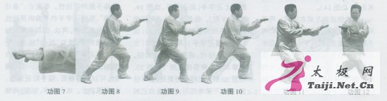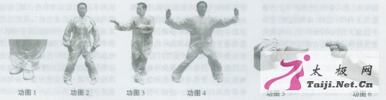 本刊应广大武术爱好者的要求,现特邀尤志心先生(尤志心,陈健侯之婿。1964年正式拜陈健侯先生为师)撰文介绍孙氏三十六手太极拳,原稿题为《孙氏三十六手太极拳诠真》,41000字左右,264幅图片。作者在解说套路的同时,特别着意撰写了每一式的“说明”与“技击含义”。这两部分有助于读者深化了解“孙氏三十六手太极拳”的内涵与演化历史。但限于篇幅,本文仅刊出了“孙氏三十六手太极拳拳势图解”及“主要步型与手型”、“基本功”,而“说明”与“技击含义”,只能留待以后了,特此说明,敬请作者与读者谅解。 主要步型与手型 除了常见的太极拳步型与手型外,孙氏三十六手太极拳还有些特殊的步型与手型,现择其要者简述如下: 1、丁八步 其步型是:一脚在前,一脚在后,前脚后跟靠后脚胫骨(内踝处)之处,两脚成450角。右脚在前为右式丁八步,左脚在前为左式丁八步(功图1)。所谓左右式都是以前脚为准,这种步型可以根据需要灵活地进行虚实变换。 2、八字扣步 两膝微屈,两脚尖内扣,脚尖相距约二三寸,两脚跟外撇,成一个八字形扣步(功图2)。 3、勾八步(错综八字步) 左(右)脚在前向左(右)外摆成45°,右(左)脚在后,向右(左)外摆成450,两脚成一错综八字步(功图3)。 4、横裆步 两脚左右开立,同弓步宽,脚尖皆向前;一腿屈蹲,膝与脚尖垂直,另一腿微屈(或自然伸直)(功图4)。这种步型又叫侧弓步。非弓非马,似弓似马,可以灵活地变化,或马步,或左弓步,或右弓步。 5、卍字手 所谓卍字手,就是五个手指分别成平、直、横、环、钩形,像一个卍字(功图5)。 6、金刚拳 在形意拳中也名“螺丝拳”。拇指压住食指第一节,而中指又压住拇指第一节,无名指和小指紧握,成一个完全封闭的体系。食指第二节明显突出,像一个锥子(功图6)。 7、豹拳 即四手指第一节相扣,第二节曲折与手背平,拇指内扣(功图7)。 [page]