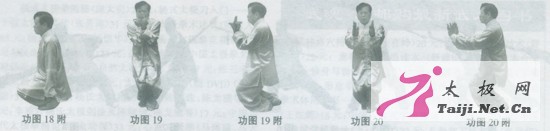 4、站卍字桩 除了众所周知的无极桩、太极桩、三体手(式)等桩功外,学习孙氏三十六手太极拳必须练卍字桩。这是一种操手桩,练法有多种形式,这里介绍最基本的一种练法: 脚成丁八步,两手并胸前,手心朝上,两肘紧靠乳头,沉肘裹肩,含胸拔背,塌腰,下肢微蹲,同时两手相对,成下卍字形(又称阴卍字手:大拇指朝前平指;食指挺直下垂;中指平横向内,与食指成直角:无名指微环;小指微钩。这样五指成平、直、横、环、钩形,好如“卍”字(功图17),成下卍字手,这是第一步。然后身下蹲(可视体力而定,体力好的年青人可尽量下蹲,以增强功力),左右两卍字手同时向下画弧形,此时两肩不能散开,而仍要沉肘裹肩,含胸拔背(功图18、功图18附)。接着刁腕向上举,拇指向外,两食指朝天,高度与目齐,两手背要紧贴,中指与手心向两侧,食指与小指分别环、勾。这动作叫“朝天一支香”,也就是上卍字手(阳卍字手,功图19、功图19附),这是第二步。第三步是,两手向内翻转,由胸前推出(这动作为圆卍字手),两手成竖掌(立掌),手心相对,成抱球状,像太极。竖掌与小手臂要成直角(功图20、功图20附)。这样周而复始,循环往复,周转不停地练习,次数视自己的体力而定。练习要配合呼吸,卍宇手向里向上时要吸气,向外向下时要呼气。