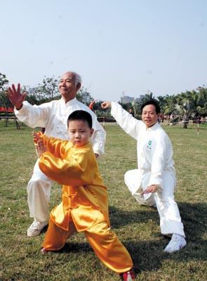 小宇轩(前)和爷爷“师弟”(后)同场亮相 第二届世界太极拳健康大会昨天在海口万绿园开幕。本次大赛共有来自10个国家地区的196支代表队共1900名运动员参加。开幕式上有一对“祖孙”特别惹眼,4岁的向宇轩居然是年近八旬爷爷施能仕的“师兄”。