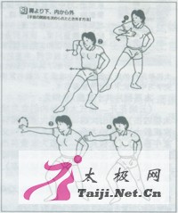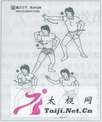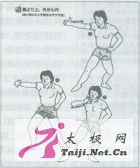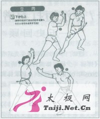笔者:日本东京帝大渡边欣雄先生赠我一册名为《祛病气功法》的书。他说此书在日本很畅销,因为内载一段新功法——武术气功法,颇受各界欢迎。现将其编译下来,寄上供武友一观。      片野贵夫,是日本著名气功师,曾多次来华在北京体育大学交流气功经验,兼学太极拳形意拳八卦掌,在日本被称为武术气功大师,著有气功丛书问世。在·册名为《祛病气功法》中,他依据太极拳形意拳八卦掌和柔术擒拿的原理,结合气功吐纳与四肢配合活动方法,发明创造出既能健身,又能御侮克敌,属于武术性质的水平圆和立圆的划圆功。当被人抓拿搂抱侵犯时,利用四肢关节的活动,便能轻巧地将侵犯者制伏。此功法今天在日本是风靡一时,受到各界的称赞,尤其受到叟妪和青少妇女的推崇,称其为护身符和防身宝!            物体圆则灵活,方则阻滞不易转动,圆球之所以一触,即能滚动自如,正因为它是圆形:方物虽经碰撞,难于动弹,是因为它有棱角,受到阻力。操练太极拳形意拳八卦掌的人的身体各部位,也要求要撑圆,打出的姿式要圆,必需“全圆化”才能“里应外合”,气圆五腑六脏、百脉俱通,气血周流无阻,顶出全身的力量,以气血为“润滑油”,用以加强各个关节的圆轴滚动作用,从而做到“四两拨千斤”!此即利用杠杆的原理,调换顺背关系,巧妙地变移力点,充分发挥“六轴”功能(六轴:肩轴、肘轴、腕轴、胯轴、膝轴、足轴)。      片野贵夫将水平圆立圆功的划圆功法,共总结出二十二种不同的力劲之巧用方法,并用歌诀的形式,指出其各个要领之所在。为节省时间和篇幅,且上口便于记忆,译者现分别将其译成浅显的五言和七言绝句:      五言绝句:滚翻搬拦转,提顿按摇顺。挂捋缠绵粘,横崩直穿拧。  [page]         水平圆立圆划圆功      水平圆有四种划圆法,立圆有两种划圆法,共分解为二十二个动作。两种圆的划法,对称相同,下面图解仅列举一侧。            水平圆划圆功:      l、从肩上由内向外划圆法(反掌破解法):①一②手学快速引至下巴处;③一④展开身体,将手掌向外张出。当对方抓住手腕往回拉时,要借对方之力,快速翻掌(图1)。诗日:彼力千均快如梭,避重就轻莫强遮。破敌取胜其中妙,只凭腕肘力移挪。      2、从肩上由外向内划圆法(向外拧腕破解法):①被对方抓住手腕时,随之翻腕迅速外张;②手掌由耳引向自身之胸前;③迅速将手掌向上向外张出(图2)。诗曰:转动变招步莫长,探臂缩腰需稳当。屈肘收身力移动,弓膝翻腕似螺旋。      3、从肩下由内向外划圆法(向内拧腕的破解法):①一②手掌抚胸,随之将手掌向后钩出;③一④利用力点,顺着手腕被对方牵动的力量,迅速用切劲翻转手掌,掌心朝内拇指朝上(图3)。诗曰:技巧本从腰胯来,两手变化随腿开。高挑低拦横掩闭,推托带领不离怀。      4、从肩下由外向内划圆法(抓腕的破解法):①一②手掌向外侧划圆时,掌心朝上返回于腋下;③一④从胸前掌心朝上振体摆出(图4)。诗曰:臂似弹簧肘比弓,射箭务必膀背圆。上下左右贴身顺,步打七成手打三。            立圆划圆功      1、由下向上划圆法(右手被对方用右手抓住时的破解法):①一②用手掌仿佛给自己洗脸,随之将手掌引向上方;②一④当手掌引向正上方时,迅速向右转体,手掌下落拇指向上挑出(图5)。诗曰:斜跨雕鞍猛甩鞭,艄公掌舵高扬帆。白鹤冲霄云端去,紫燕抛翦林中穿。      2、由上向下划圆法(右手被对方用左手抓住时的破解法):①一②手掌下落大腿根处,小指朝上向前挑出;③转胯.将手掌甩向自己的头上(图6)。诗曰:斜身扭胯掌似揉,提肛吸胸臀需收。振臂犹如虎甩尾,车轮滚滚肩为轴。(作者为华中师大历史文化学院教授)