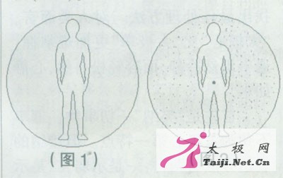 六、现代太极拳应该注意的两个问题 1,“两仪起式”更加符合太极原理 易有太极,是分两仪。在太极拳上两仪为“上虚下实”。首先让习拳者自己进入“无极”中。空洞无物,一切以“静”表示。我们叫它一进无极(图1)。静极生动,在人体反映出“气”动于下丹田,我们叫它二进有极(图2)。