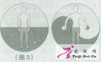 拉直脊柱,头悬骶坠,上虚下实,清气上升到头顶求阳,浊气下降到脚底求阴。我们叫它三进两仪(图3),人动两仪动(图4)。