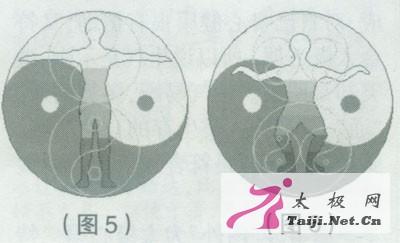 在“两仪起式”的基础上变化出各招各式而成其拳路。“上虚”之中再分虚实,“下实”之中再分虚实。为二进四(图5),四进八(图6)。我们叫它为运化太极的过程。