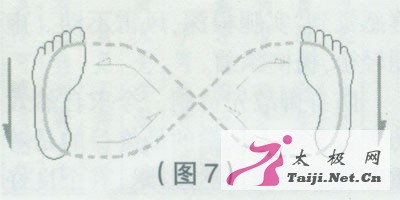 所以说“两仪起式”是太极基础理论在太极拳中最重要的应用。也是学习太极拳绝不可缺少的主要部分。 2,要加强太极拳的“腿功”练习 在多数太极拳的套路中,腿的动作要求明显不足,特别是在分两仪的基础上的腿功。上虚下实,是两仪在人体上的体现。腿的虚实是在“下实”之中变化的。下面介绍两种方法“缠丝腿”和“飘腿”。 (1)缠丝腿(站立)有顺缠丝腿和逆缠丝腿两种。两腿宽度一般不能超过本身的一肩半,超过有强为之嫌。 具体要求: 脚用力依次传导。从脚趾、脚侧、脚跟从前往后运行为顺缠丝腿。由脚跟、脚侧、脚趾从后往前运行为逆缠丝腿。 膝盖从里往外旋转为顺缠丝腿,膝盖从外往里旋转为逆缠丝腿。 肩胯为正面,从正面往外转为顺缠,从外往里转为逆缠。 顺缠丝腿是实腿转变为虚腿,逆缠丝腿是虚腿转变为实腿。 以上四点要求是练好缠丝腿的关键。缺一不可。 如练习时,从左腿开始。重心先落在左腿,膝盖弯曲下沉为实腿。右腿微伸直为虚腿。力点在左脚趾前端,肩胯正直。先开始力碾左脚大脚趾到小脚趾,再由小脚趾转力到脚侧再到脚跟。同时,肩、胯、膝盖随力点的依次传导变化向左外旋转。缠丝劲由左脚跟绕腿上行,通左肾到右肾后,下行绕转于右腿到右脚的前端。同时,左腿慢慢在缠绕过程中伸直成虚腿。右腿渐渐屈膝变成实腿。再由右脚趾前端依次向脚跟碾力上行。从左腿而论为实变虚,此方法为顺缠丝腿(图7)。