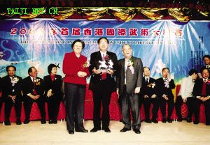 范徐丽泰女士为萧山队员颁奖 萧山太极拳在香港大大扬名了。在刚刚结束的2006年首届香港国际武术大赛中,萧山大地传统太极拳研究会的13名队员获得团体总分亚军,香港特别行政区立法会主席范徐丽泰前来捧场,并为萧山队员颁奖。