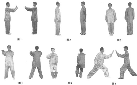 甲乙两人面向并步站立,身体保持自然、放松、中正。两人距离约2米,互行抱拳礼(图1)。未习武先明礼、先明德,交手训练时先行抱拳礼既是尊重对方又是庄重承诺严守武德,潜移默化修养心性、完善人格,以礼始、以礼终,武术交手训练不可或缺,以互不伤害对方的练功方式提高交手技法,拳技乃诡道,武德是圣道,以圣道统制诡道是中华武术的传统。 1、预备势 礼毕,甲乙两人双臂自然下垂,相互注视对方肩部,进入推手套路练习预备阶段(图2)。图中深色衣服者为甲方,浅色衣服者为乙方。甲乙双方各右转身90°,背向而立(图3)。 2、起势 甲乙双方同时抬手起势(图4),屈膝下蹲,重心移在右腿上,左脚掌虚点地,左手下,右手上,掌心相对环抱(图5),左脚向身体左前方(即对手方向)上步,同时左手臂随腰左转、随上步前伸,右掌心向下,自然垂放胯旁,双方成左弓步相对,目视对方(图6)。 3、甲转身上步右反臂拳击乙头 甲身体后坐重心落于右腿,左脚微提、脚尖外摆踏实,重心再落于左腿,左转腰上右脚跟步,双手经过右手下、左手上、掌心相对环抱动作,右手变拳,右转腰右臂从下方向右上方摆动,随上步用拳背(也可反掌)击乙头部,由虚步经过马步落成右弓步,左手按于腰间(图7)。 4、乙换步右小臂击甲后肘部 乙同时身体后坐重心落于右腿,左脚提起脚尖外摆落于右脚前,重心放在左腿,左转腰右脚掌虚点地,以右手下、左手上、双手掌心相对环抱的动作防守,在甲上步右反臂拳击头将到未到之机,上右步出右手从下方斜向上,用小臂截击对方后肘关节(图7),(也可以用上穿、滚、架之柔劲,旋臂将对方发出。)由半马步渐成右弓步,左手按于胯旁(图8)。