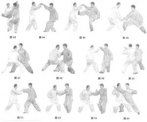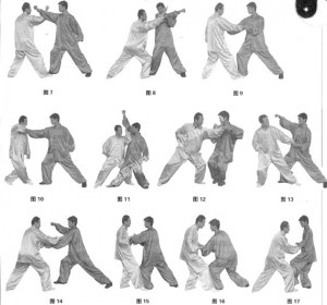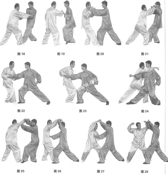 5、甲左掳上步右中平拳击胸口 甲为了防止对方击伤自己肘关节,在乙小臂挨住自己肘(或衣服)时,随对方速度重心后移、左转腰引化,使乙落空;同时左脚跟上半步,左手从右臂下穿出,顺势掳住乙小臂或手腕(图8);右转腰,抽回右臂,右脚上步成右弓步,同时右手变拳前冲,击乙胸或腹部(图9)。 6、乙右手拨换身绕步左托肘靠 乙左脚向左后方撤步,随对方冲拳速度重心后移,右脚成虚步,化解来拳(图9);右手从对方虎口处旋转脱出,反手由上拨甲右臂肘关节,向右转腰右脚提起、落在对方前脚外侧(图10),上左脚到对方后脚后侧,左手虎口卡住对方右大臂下部,右脚瞪地,左手向上再向前方呈弧形上托左靠(图11)。 7、甲脱袖左掳腕右拳掼头 甲为了避免被对方拔根掀起摔倒,不顶不抗随劲而走,根据对方来力和步子大小,左脚活步后撤,右脚随成虚步(图11);左手从甲臂与自己胸前、右腋下穿出,抓住乙左手腕向后掳(图12);右脚提起落在乙身后,同时右手抽出,右掼拳击打对方后脑(图13)。 8、乙撤步右捋 乙随对方冲拳速度重心后移,转腰左手翻腕,掳住甲左手腕回带,左肘、臂要起到防护自己头部的作用(图13),乙左脚向后方回撤、左手回带,右手顺势扶按甲左臂肘关节,右脚瞪地,随左转腰身体下沉,右手下压,左手掳甲手腕至左腰间,右手按甲肘关节部到腹前,步型落成左弓步下捋(图14)。 9、甲垫步上步左挤 甲为了防止被乙捋倒,全身放松不与其对拉,随着对方力量和方向在运动中调整重心(图14);对方用力捋时,根据捋的劲力长短距离,两脚随机上步(或垫步),右脚落步的位置在对方面前较为有利,上左步到乙的裆部中路、脚的后方夺其位,左小臂平行于胸前,右手掌心按于左手腕处,随左转腰右脚瞪地,左腿弓步前挤(图15)。 10、乙退步按推 乙随对方挤势往己怀内引,左脚向后撤步重心后移,右脚活步后跟,左手虎口卡在甲左手腕关节处,右手虎口卡在甲肘关节上(图15);当对方挤到头时,双手松沉下按使来力落空(图16),当甲方感到重心前倾开始回撤时,顺对方回力由下向上呈弧形推出,步型成弓步(图17)。 [page] 11、甲左横移插手绕右步上左步按推 甲顺化乙方推按,右脚活步后退(图17),左脚向左前方上步闪身,同时左臂粘黏连随乙方双手后引,自已的右手从乙左臂上方向右臂下穿(图18),右脚向左绕上步,同时右手从乙右臂下穿过,翻腕掳住乙右手腕,左手掌心对准乙右肘尖部(图19),左脚上步,右脚瞪地,双手推按,成弓步(图20)。 12、乙顺分手双拳掼头 乙随甲的推力,后脚撤引,前脚活步后退(图19),左手从甲方右手腕下方向上穿出回带,右手在肘尖引领同时,从甲方左手臂内侧向上穿出回带,两掌心斜向上(图20),将甲方推力引尽时,双手小臂外旋,将甲方双臂向两侧分开,略宽于肩,右脚上成弓步,双手变拳内旋里合,击打甲太阳穴(图21)。 13、甲退步双按分腕上右步中拳击胸 甲后脚先退,前脚活步随撤,后退的同时,己双手腕搭在乙双臂外侧上向后滑动,头部撤出乙拳的打击距离(图21),乙的攻击将到极点时,双手松沉下按外分腕,转腰上右脚,落在乙的中路,右手变拳,随转腰弓步右冲拳,击打对方胸腹部(图22)。
