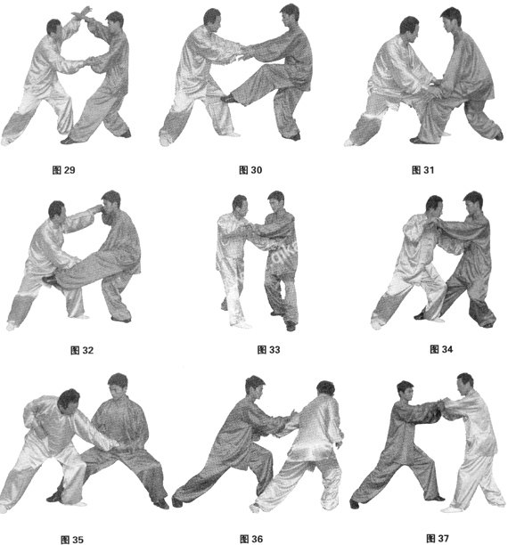 14、乙转腰闪化上右步直列 乙随着对方的上步,左脚向左后方略退,右脚撤成虚步,右转腰,闪开来拳(图22)。随着甲的冲拳,乙左手扶在甲臂肘关节外侧,右手扶在甲臂里侧下滑到腕部(图23),右脚踮起从甲右脚外侧上步,右手臂从甲肩上脖根处前伸直列,用力方向在前下方,全身放松、下沉成右弓步(图24)。 15、甲撤步右架左挑换步右推掌 甲随乙的上步重心后移,同时右臂在乙臂下略架后滑(图24),右脚后撤,换左小臂从乙腋下穿进上抬,右转腰,右脚踏实(图25),右手收于腰间,右脚瞪地, 左脚上步,随左转腰左臂向上向外呈弧形滚架乙方右臂,右掌前推,掌根击打乙胸腹部(图26)。 16、乙左臂滚压上架右手砍肋 乙随对方推掌后脚活步后退卸化(图26),右脚回撤,含胸右转腰, 同时左小臂搭在甲右小臂上,随转腰沾起甲右小臂(图27),向上方架住甲左臂,左手掳住甲左腕部,左臂继续向上弧形滚架,破坏甲的平衡、稳定,暴露出软肋,右手回抽(图28),左脚上半步,右脚瞪地,右手变掌随转腰砍甲左肋,步型成左弓步(图29)。 17、甲后坐身右抓腕左下掳左弹腿 甲随乙的上步砍肋后脚活步后退,重心落于后脚,右手从左臂下掳乙左手腕回带,左手从乙虎口处旋拧脱出,随左转腰下掳乙右手腕(图29),起左脚弹踢甲裆或腹部(图30)。 18、乙左右手翻腕下采甲双腕 乙双手从外侧翻腕,分别掳住甲左右手腕,当对方左脚抬起尚未踢到时(图30),前脚点地,后脚略抬起向身后落地,身体下沉,同时双手握腕下采,使对方脚中途落地(图31)。
