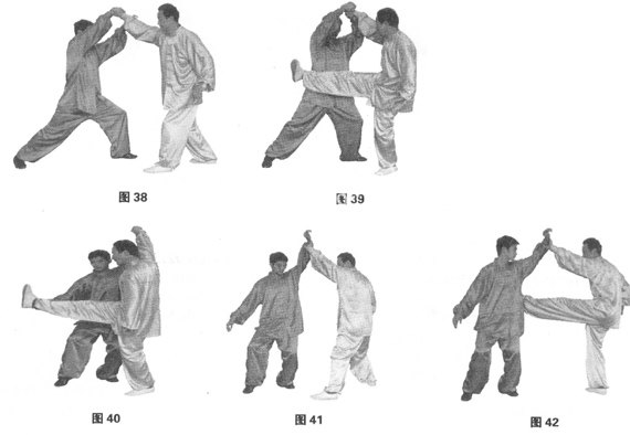 19、甲二次左弹腿 甲被采脚落地时随势下沉卸去采劲(图31),再次起左脚弹踢甲裆或腹部(图32)。 20、乙右手下插拨接上步左挤 乙右手抓着甲左腕往甲腿中路下插,向右前方外拨开对方左腿关节,保护被踢部位(图32),右脚向右前方上步,左手引领甲右臂贴于胸前(图33),左脚随转腰上步插入甲腿中间,右手掌按于左手腕,右脚瞪地,左弓步前挤(图34)。 21、甲撤步转身右撅臂 甲随挤劲左脚后撤(图34),左手落在乙左手腕处,左转身90度,使挤劲落空,同时左手掳乙左手腕,右前臂压在乙方左臂肘关节处,再向左转腰,身体下沉,右脚蹬地,成左弓步右撅臂(图35)。 22、乙垫步转身脱袖右外摆腿击肋 乙被撅臂时全身放松、舍己从人不抗劲,随对方速度、力量的大小,上右步(或踮步),使左臂化解甲撅臂的攻击(图36),回转身,右手从左臂下穿出,掳住甲右手腕(图37),再以左脚上步(以右脚能攻击到甲有效部位为宜)踏实为支撑轴(图38),右脚飞起外摆踢向甲的右肋部(图39)。