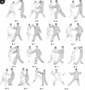 32、乙右掳左拳掼头 乙右手外推甲方右手腕并掳住(图54),后脚活步略退,左转身90°,同时左脚点地撤出、左手回抽(图55),左脚上步落在甲前腿外侧,左手外摆变拳,掼击对方头部,重心前移成左弓步(图56)。 33、甲左掳右反背拳打面 甲身体随乙掼击的速度后移重心(图56),右手回带,左手从右臂下穿出掳住乙右腕,右手脱出变拳,顺势以肘关节为轴呈弧线反背拳击打乙面部,重心前移成右弓步(图57)。 34、乙左压上左步右扇脸 乙在甲击到之前身体左闪进,躲开来拳(图57),左拳顺势变掌,顺甲臂反背拳的方向,搬滑破解后继续向下向左压拨(图58),右脚蹬地,右手变掌随转腰斜向上扇甲左脸部,重心前移成左弓步(图59)。 35、甲撤右步左托肘化解 甲随乙扇击速度重心后移(图59),右脚根略抬起撤步,左手托在乙肘部,顺扇击方向呈弧线拨动,略改变乙臂的运动轨迹,化解进攻(图60)。 [page] 36、乙上右步左扇脸 乙右臂被甲拨到左侧过程中,也利用接触点弧线引化(图60),同时右脚上步封对方左脚,挥左臂随转腰斜向上扇甲右脸部(图61)。 37、甲撤左步右托肘化解 甲随乙扇击速度重心后移,左脚根略抬起撤步,右手托在乙肘部,顺扇击方向呈弧线拨动,略改变乙臂的运动轨迹,化解进攻(图61)。 38、乙上左步右扇脸 乙左臂被甲拨到右侧过程中,再利用接触点弧线引化(图61),右脚蹬地,左脚上步封对方右脚,右手变掌随转腰斜向上扇甲左脸部,重心前移成左弓步(图62)。 39、甲托肘化解上步右扑面掌 甲随乙扇击速度重心后移(图62),右脚根略抬起撤步,左手托在乙肘部,顺扇击方向呈弧线拨按在乙身上,左脚上步,右脚跟进,贴近对方,同时右手变掌扑向对方脸部,或用掌指戳向乙眼眶(图63)。 40、乙撤步十字手架掌 乙在甲掌指戳来之际前脚活步后退(图63),双手以交叉十字手架起甲方右手腕部,略高于头(图64)。 41、甲右蹬脚 甲右手被架时乙的中部空虚,趁此机会抬右脚前蹬,攻击乙心口部(图65)。 42、乙撤步掳腕双手下采 乙在甲方抬脚时,右手翻腕掳甲右手腕,左手翻掌按在右手腕上助力,左脚回撤,身体下沉,两臂放松向下抖采,步型成半马步(图66)。 43、甲上步跟进换步右架左推掌 甲随乙的采劲落步跟进,活步调整自己和乙方的距离,并落在乙右腿内侧(图66),随即右脚活步、右手带起乙右臂,翻手掳住乙方右手腕架在额前(图67),左脚上步到乙身后合适位置,前四后六,左手立掌贴在乙右肋部,右脚蹬地、双手同时向前推出,重心前移成左弓步(图68)。