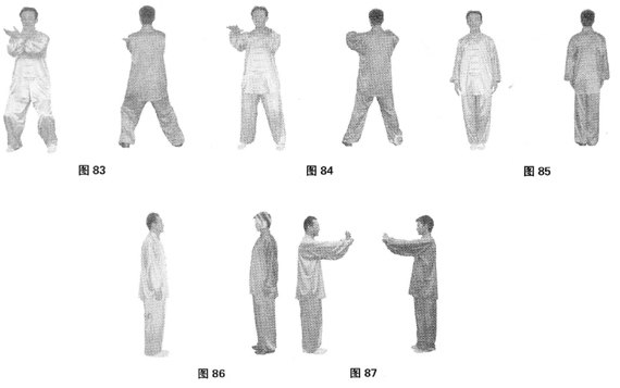 48、乙右掳左掐脖 乙根据甲冲拳击打速度,右脚点地略撤、身体重心后移(图75),顺势右转腰闪躲开来拳,右手顺甲左臂下滑落在甲右臂上抓掳右腕,也可略向外改变来拳方向(图76),同时重心前移,左手前伸戳击,或张开虎口掐甲喉部(图77)。 49、甲双分手抱肘上步发放 甲前脚点地重心后移,消化乙方前掐之势,右手回带(图77),双手从乙方双臂内向外旋拧(图78),把乙方手掌引至腹部,用小腹抵紧,双手握抱固定对方双臂(图79),左脚上步落在乙两腿中路(图80),右脚蹬地发力,左脚前上夺位,通过腹部传递力量给乙、双手控制乙双臂,把握抛掷的角度,整体合力将对方抛出(图81)。 50、乙顺势后跳退步 乙随着甲的发力,顺势通过后跳调整自身动态平衡,两人断开(图81)。以甲为上手、乙为下手的第一路练习完成。 51-100、第二路练习 甲乙换上下手,乙垫步上步右反臂拳击甲头开始,相互练习对方的攻防技法,作为第二路练习。当甲随着乙的发力,顺势通过后跳调整自身动态平衡,两人断开时,以乙为上手、甲为下手的第二路练习完成。 101-150、第三路练习 甲乙换左右势,仍然以甲为上手、乙为下手,甲换步上步左反臂拳击乙头开始,招法相同、左右互换。当乙随着甲的发力,顺势通过后跳调整自身动态平衡,两人断开时,以甲为上手、乙为下手的另一边的第三路练习完成。 151-200、第四路练习 甲乙再换另一边的上下手练习,乙换步上步左反臂拳击甲头开始,相互练习对方的攻防技法,作为第四路练习。当甲随着乙的发放,顺势通过后跳调整自身动态平衡,两人断开时,以乙为上手、甲为下手的另一边的第四路练习完成。 201、收势 两人断开,屈膝后坐,重心移至右腿,上体右转,右手随转体向右同时与左手向左分掌,肘微屈,经过左横裆步(图82),两手继续下抄经过腹前返上合抱,同时左脚收回至与肩同宽,两腿蹬起,成开立步,两手十字交叉,位于胸前(图83),两手向外翻掌,手心向下(图84),两臂下落于体侧,左脚并右脚还原成并步直立姿势,目视前方(图85),甲乙双方各左转身90°,面向而立,身体保持放松、中正、呼吸自然(图86)。互行抱拳礼(图87),以礼始、以礼终。 这样打完四路可以把基本技法动作的左右和上下手全部练一遍,练习中要特别注意掌握舍己从人、不丢不顶、随屈就伸、引进落空、借力打力等操作原则,沾粘连随在一起追寻以柔克刚的推手韵味。 套路推手训练还具有较好的按摩、医疗保健、强身健体的功能。在程式化推手中,相当于双方相互“按摩”,配合呼吸、自然合道,全身上下内外一动无有不动,不但各个关节得到运动,全身的肌肉、筋腱、经络系统也都得到锻炼,使形体和大脑神经、脏腑气血相摩相荡,促进气血贯通、新陈代谢、免疫系统修补机能,从而获得预防、医疗、保健、延年益寿的效果。推手中阴阳虚实、刚柔相济,以技击动作对操比个人盘架单操起到了更佳的健身作用。既有利于年轻人的生长发育,也有利于所有习练者的身心健康和技击技能增长,是完全符合科学的。 套路对练中的技法纯熟掌握后,可以不按现有顺序,尝试着各自随意连接、重新组合练习。也可以把对练套路中上(或称甲方)下(乙方)手的动作招法作为个人套路单独练习,其中没有一个废动作,能够很快找到“眼前无人似有人”的感觉,比一般单练套路效果好的多,可以收到事半功倍的效果。还可以将套路对练中的技法拆开,两人反复单招操练,求索熟能生巧、精益求精,这就开始进入散推手的练习阶段了,交手中根据对手的变化随机滋生衍变出适用招法,凭借感知觉(听劲)产生出正确反应,可打、可踢、可摔、可拿。 |