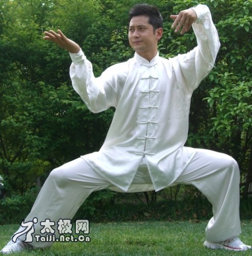 陈式太极拳主张全身整体劲内外统一性的蓄发相变是需要“一身备五弓”“五弓合一”的。现试述如下: “一身备五弓”是比喻身躯犹如一张弓,两手为两张弓,两足为两张弓。 “五弓合一”即为全身的整体劲,触之则旋转灵活,能蓄能发,滔滔不绝。 身弓,以腰为弓把,脐后腰脊命门穴始终用意贯注,中定而不摇摆,动作时以命门穴为原动力,两腰肾旋转抽换,带动胸背部肌肉弧形松沉,变换虚实。合、虚、吸气、蓄势时,小腹内收,膈肌上升,内气上行聚于胃部,胃部自然隆起,胸廓自然扩张。命门穴先有微往后撑松沉之意,在提顶(百会穴虚领顶劲)、吊裆(会穴托起丹田), “上下一条线”的身法中正状态下,使重心稳定下降。在推手运化时能做到螺旋式引进而又“让中不让”(不失我之立身中正)的作用。开、实、呼气、发劲时,小腹外凸,膈肌下降,胃部内气下行丹,胃部和胸廓自然平复。落胯塌腰,腿劲下沉,而内劲往前透发。带脉(腰部周围一圈)膨胀,冲脉气旺,命门穴继有微往后撑之意。哑门(颈椎第一节)和尾骨为弓梢,上下对称,调节动度,加强其蓄而后发之势。身弓备,则腰部柔韧、中定而下沉,上于“哑门”虚竖,大椎鼓起(即“拔背”“气贴背”的作用),下于尾骨前送,起到舵的作用而内劲有上翻之意。 手弓,以肘为弓把,用意注于肘节,使沉着松静而有定向。手腕和颈下锁骨为弓梢,弓梢必须固定,前后对称;手在松柔灵活中用坐腕来固定(掌根微微着力而下沉,腕节柔而不软,称作“坐腕”);锁骨用意来固定,不使摇摆,锁骨管着两手的动向,锁骨的固定是两手有定向的前提。手弓备,则听、拿、化、发,处处能整而不乱。 足弓,以膝为弓把,胯骨与足跟为弓梢。弓腿时,前腿胯根松沉而前送,膝关节有力而微前挺(不可超出足尖),后腿膝关节有力而微前送,而胯根则松沉而又后撑。后坐时,臀部与足跟齐为度。前进后退,臀部之劲要贯到足跟,两足根(足趾、足掌、足跟)下沉,利用地面反作用力,使能劲往上翻,腰腿之劲自然相顺相随。 “有上必有下,有前必有后,有左必有右,相反相成,对拉匀称”。使能做到劲起脚跟,注于腰问,通于脊背,形于手指。 五弓合为一弓,以身弓为主,手弓、足弓为辅,并以腰为轴,上于两膊相系,下于两腿相随,上下相随,中间自然相随。 每站一势,须检查五弓是否俱备,五弓是否合一,是否形成既能“八面支撑”,又能“八面转换”的蓄势。 “八面支撑”是稳固厚重,“八面转换”是旋动灵活。 太极拳全身的总虚实在于腰肾的转换,腰肾转换的枢纽在于腰脊命门穴。腰脊一转而周身全动,缠绕运转,顺遂无滞。内外合一而主从不乱,上下相随而贯串协调。腰脊命门穴是“身弓”中的关键。 推手时一搭手即五弓俱备,源动于腰脊,缠绕运转,劲贯四梢,呼吸行气,周身劲整。才能“机由己发,力从人借”,弧形走化,直线发劲,动之至微,发之至骤,蓄发相变,滔滔不绝。所谓“全身都是拳”“全身处处是太极”“但依着何处,便从何处击之”。 五弓合一是全身内外整体劲练法的一种具体规定,练拳和推手是一致的、相辅相成的,练拳即为推手,推手仍是练拳。一站势为静,静中触动,一变势为动,虽动犹静。处处时时能“五弓合一”,是做到“劲以曲蓄而有余”的必要条件。 今以五弓合一歌诀概括其窍要: 身是弓身劲似箭,踢打拿跌不斗力, 内外相合管中线,一身五弓备蓄发, 黏随引进走螺旋;离弦莫叫与穴偏。 上下左右中气先;敷盖对吞细钻研。