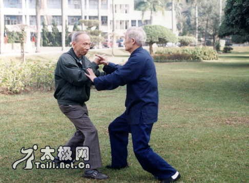 (九)、太极拳推手,纯以柔顺为主,惟逞强好胜者,多以蛮力推人,或用手抓人,皆未得太极拳之真旨。因用手抓人,其劲在手,其心必空,心空被发,不伤即残。又不可存心先想打人,因意念在先,心理上先僵,其手脚自然僵硬,致败无疑。盖推手彼此相接,我有沾黏贴随,何必急于一时打人,要乘机随势发人,方能从容轻松,且不露形,不露形手必不动,则发人劲整而贯串,人不知我,我独知人,使人跌出而尚不知其所以然。所谓﹁发人无形无相﹂即此理也。 (十)、推手能知变换为重要原则,初学者固须如法练习,若已熟练,则不可墨守成规,必须因敌制应,做到能攻能守,运用自如,方可克竟全功。故运劲忽隐忽现,手法宜时实时虚,身法随黏随化随发。为习推手技击,应当熟知顺变之道。因个人技巧不同,其变化复杂无穷,彼此相接之时,在意识上即产生一个定向,找到对方重心僵硬之点或面,彼未走化之前,我手轻置其身上,无论对方如何走化,原预定之定向,亦随之转变,彼稍有微动,或一顶一抗,我即顺势而放,则敌无不应手而跌矣。 总之,太极拳之推手,主要在于提高听劲能力,以发挥力学杠杆之作用,而其用全在意识,所谓得机得势,舍己从人,牵动四两拨千斤,皆在用意不用力。现一般人推手,不大注意腰腿动作,多以猛力推人,均与拳理相违背,或拘泥于外形招势,只知以招破招,此实亦不足以应敌,首应以静制动,执一驭万,视敌势而变化,活用招法;若能运用成熟,彼此相接之时,一松沉,一走化,常使对方毫无所觉而跌倒;其劲在于分寸之际,发劲愈短,其效果愈佳,愈狠愈脆,干净利落,亦足以表示功夫愈深。故高明者与人推手,无招势可言,皆是顺势趁机借力,制服对方,方为正着。所谓得其环中,以应无穷,即此意也。学者只要依其诀,悟其理,得其法,守其窍,生其巧,循行不辍,自然功到有成。 |