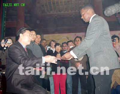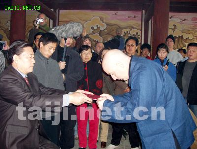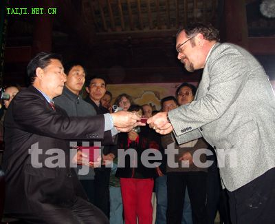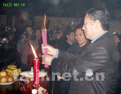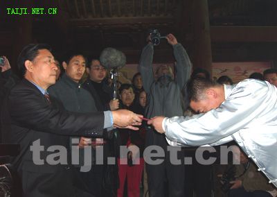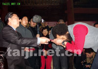 近日,太极拳大师陈小旺先生回到了家乡——陈家沟。随他前来的有15个国家和地区共70多名太极拳爱好者,向陈小旺大师学习太极拳的同时,这些不同肤色、不同语言、不同年龄的人们相聚在一起,尽情领略太极故里的神奇魅力,感受拳乡的民俗风情。今天上午,他们之中的28名太极拳爱好者有幸被陈大师正式接纳为入室弟子,成为陈氏太极拳的正宗传人,在陈家沟太极拳祖祠举行了拜师祭祖仪式。仪式由陈氏家族理事会主持,温县县委副书记、太极拳研究发展中心主任刘同旺、温县武协主席史绍文做为见证人也出席了拜师仪式。