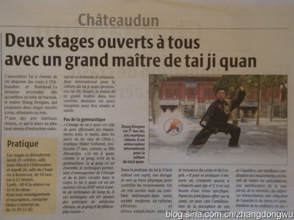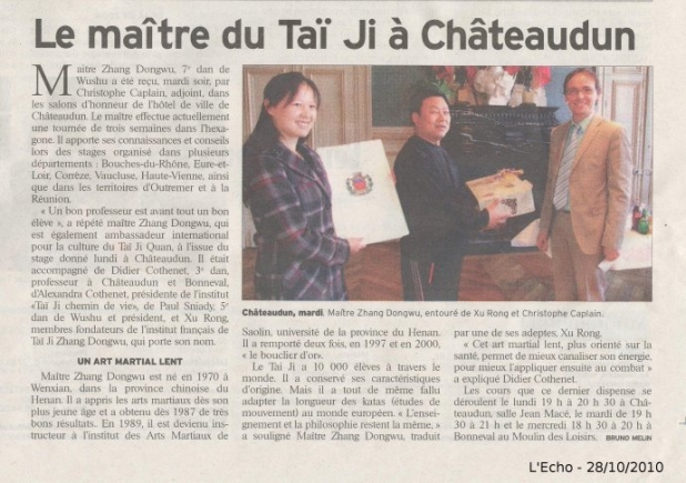 2010年10月19日至11月8日,法国张东武太极学院成功地邀请并组织陈氏太极拳名家张东武老师赴法国进行为期20多天的太极拳巡回讲学活动。此次巡回讲学由张东武老师亲自主讲,太极学院院长保罗全面组织,副院长徐蓉随行翻译。张东武老师一行所到之处,都在当地掀起了一阵中国太极文化的旋风。