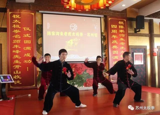 元月1日,陈家沟朱老虎太极拳苏州馆四周年庆典暨朱峰开山收徒仪式在美丽的金鸡湖畔凌轩阁大酒店隆重举行。陈家沟朱老虎太极拳功夫总院副院长朱堡垒,中国当代著名书法家王杰民,苏州市市容市政和历史街区景区管理局处长朱明华,苏州大学武术系副主任、硕士生导师张宗豪,苏州天园景观艺术工程有限公司董事长张平,苏州市徐州商会秘书长董双庆,翰泰工贸有限责任公司董事长胡银行,永康朱老虎太极拳法研究会会长任保才、主教练任保良,海宁朱老虎太极拳馆馆长辛红庆,陈氏太极拳第十一代传人朱路,贵州市朱老虎太极拳馆馆长唐笑笑,金芒果教育创始人王雨涵,鑫源古筝私塾耿琦、李岩以及来自永康、海宁的拳友和拳馆的学员们欢聚一堂,共同见证拳馆在苏州的发展历程。