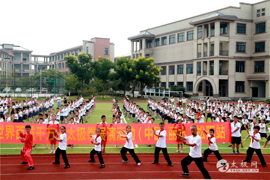 (太极网报道)9月8日,2017世界百城千万人太极拳展演浙江丽水站于丽水松阳望松城北小学举行,在该校校长王伟东以及陈照森大师入室弟子陈朝富的积极组织下,千余名小学生同武太极,充分彰显了太极拳的魅力,助力世界百城千万人太极拳展演。