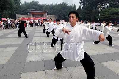 2012年9月1日,在沈阳市中山公园,一队身着武术服的市民在表演太极拳。当天,中华武术沈阳地区会员俱乐部武术太极交流大会隆重举行。这次交流大会是为了迎接“十二运”,普及全民健身,弘扬中华武术而举行的,共有来自沈阳各个地区的20个代表队参加。